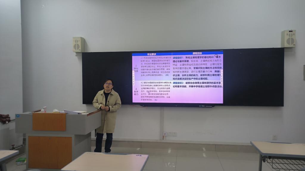 祝景彬副教授从课程评分标准、评价方法、评价依据、评价结果分析及改进措施等方面,对如何进行课程目标达成情况评价进行了详细介绍。地理科学专业的三位任课教师对上学期开设的《土壤地理学》《生物地理学》《经济地理学》等专业核心课程的课程达成情况进行汇报,并分享经验。期间,老师们对课程目标达成计算方式、考核方式、课程改进措施等展开讨论。通过此次培训与汇报分享,老师们深入学习了如何进行课程目标达成情况评价及持续改进,对后续课程评估工作的开展充满信心。