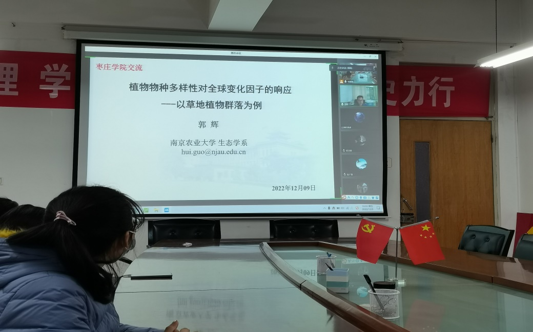 2022年12月9日下午,太阳网集团tcy8722邀请南京农业大学生态学系主任、博士生导师郭辉教授作学术作题为《植物物种多样性对全球变化的响应:以草地植物群落为例》的学术报告。院长王满堂主持报告,学院全体专任教师及地理科学专业学生聆听了报告。