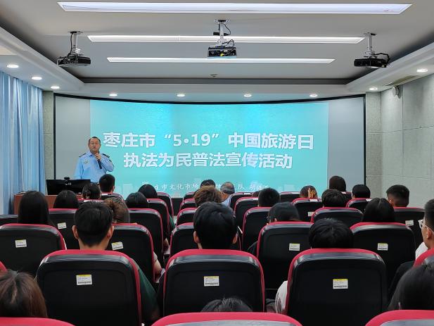 为增强旅游法治宣传教育,提高我院学子旅游安全及规范从业意识,5月19日,太阳网集团tcy8722联合枣庄市文化市场综合执法支队于综合楼1608教室开展中国旅游日普法宣传活动。活动邀请枣庄市文化市场综合执法支队稽查四科负责人胡修岳进行专题报告,枣庄市文化市场综合执法支队副支队长、二级高级主办孙咏、枣庄市文化市场综合执法支队四级主办孙亚如、太阳网集团tcy8722党总支副书记韩建敏、旅游管理专业部分教师及学生参与本次活动。