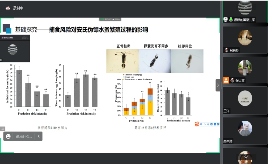 报告会上,郝雅博士做了“捕食风险对海洋桡足类生理,行为和繁殖的生态学效应研究”的学术报告,介绍了海洋经典食物网内捕食风险的生态效应研究现状,以海洋生态学模式生物安氏伪镖水蚤和海水青鳉鱼构建了捕食关系模型,介绍了安氏伪镖水蚤对捕食风险的生理响应特征,研究发现,捕食风险对安氏伪镖水蚤不同生活史阶段个体的影响存在差异,相比于无节幼虫和成体,桡足幼体在面对捕食风险其能量代谢过程表现出更高的脆弱性,产生了更显著的非消费效应。捕食风险通过影响安氏伪镖水蚤繁殖过程降低了其生殖力,减少繁殖后代的数量。该研究可为揭示海洋经典食物网中种间交互作用的生态学机理提供基础数据,也是对海洋生物多样性维持和保护思路的重要探索。