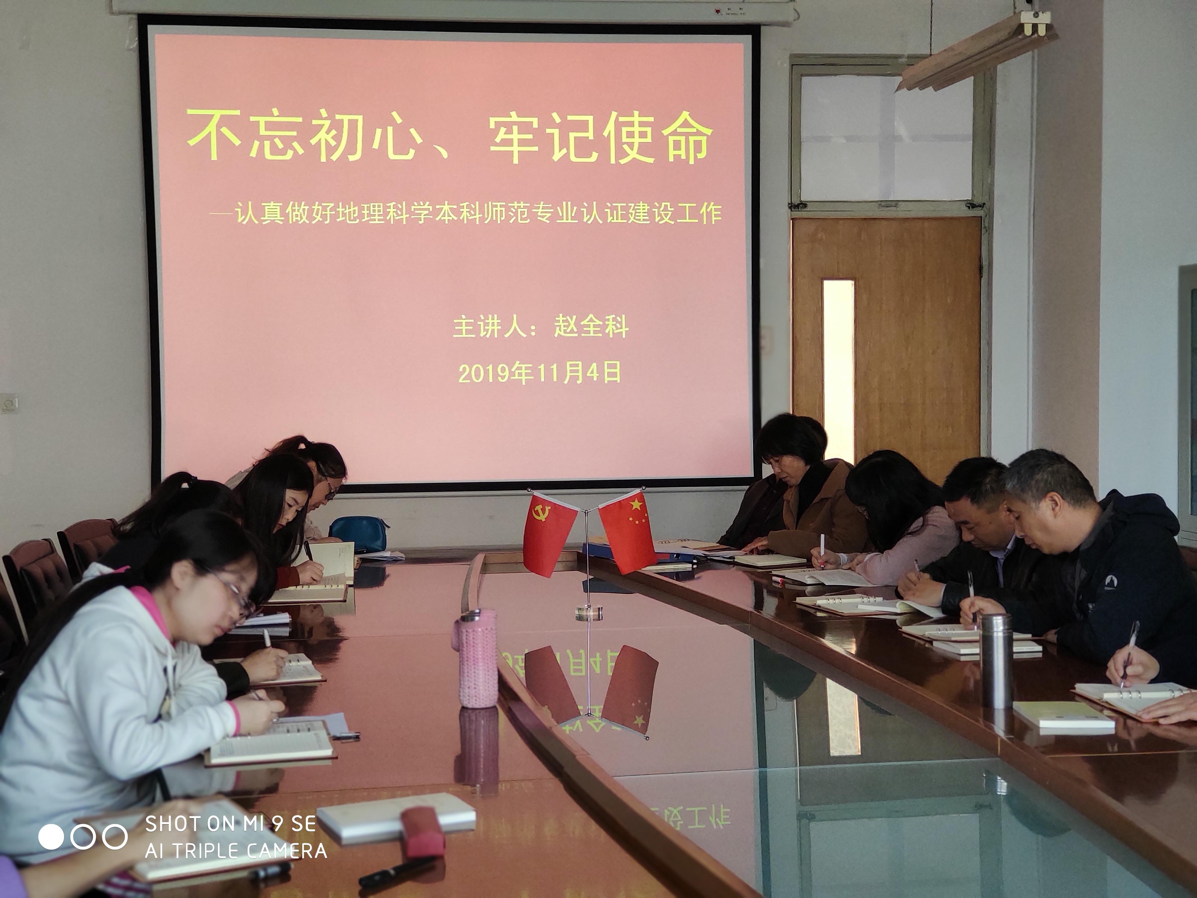 按照学校“不忘初心、牢记使命”主题教育工作部署与要求,11月4日下午,太阳网集团tcy8722在理工楼2514会议室开展主题教育专题党课活动,院长赵全科讲了题为《不忘初心 、牢记使命—认真做好地理科学本科师范专业认证建设工作》的党课,全体党员聆听了党课。