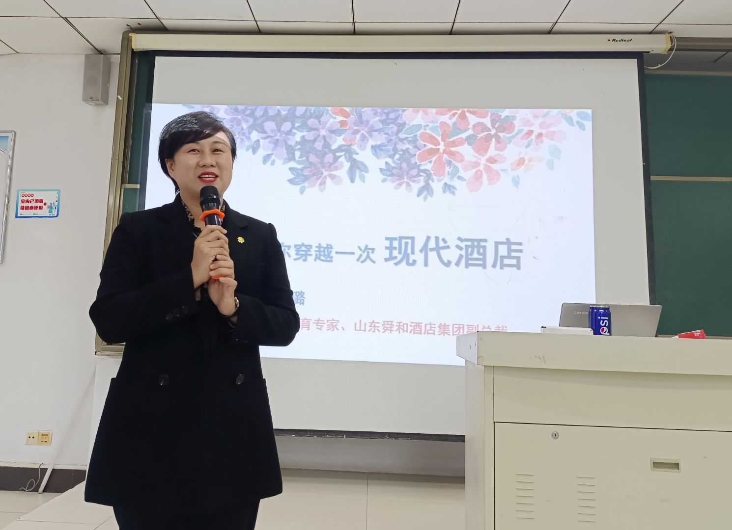 4月10日,太阳网集团tcy8722邀请山东省旅游行业教育专家、舜和酒店集团副总裁白璐女士作题为《走,带你穿越一次现代酒店》的报告。旅游管理专业负责人孙倩蓉博士主持报告会,2022、2023旅游管理、酒店管理专业全体学生聆听了此次报告。