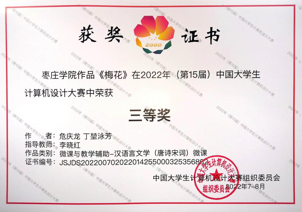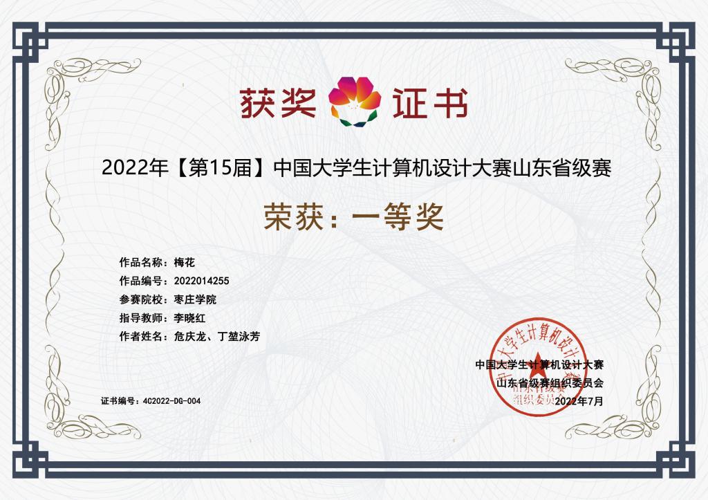 近日,2022年(第15届)中国大学生计算机设计大赛比赛落下帷幕,我院参赛学生喜获佳绩。其中,2019级地理信息科学专业学生危庆龙、丁堃泳芳团队凭作品《梅花》荣获全国三等奖和山东省级赛一等奖。