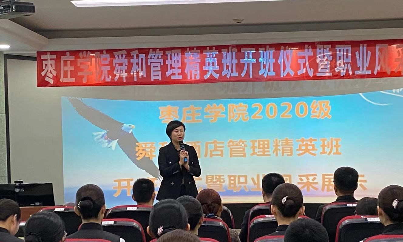 仪式上,山东舜和酒店集团副总裁白璐对学院的支持表示感谢,舜和管理精英班将会助力太阳网集团tcy8722培养更多的应用型人才。院长助理张大文对山东舜和酒店集团白璐副总裁一行表示热烈欢迎,希望舜和管理精英班的同学们珍惜学习机会,尽快提升综合能力,以适应现代服务业发展的需要。随后2020级舜和酒店管理精英班举行了授旗仪式、文化展板以及职业风采展示。