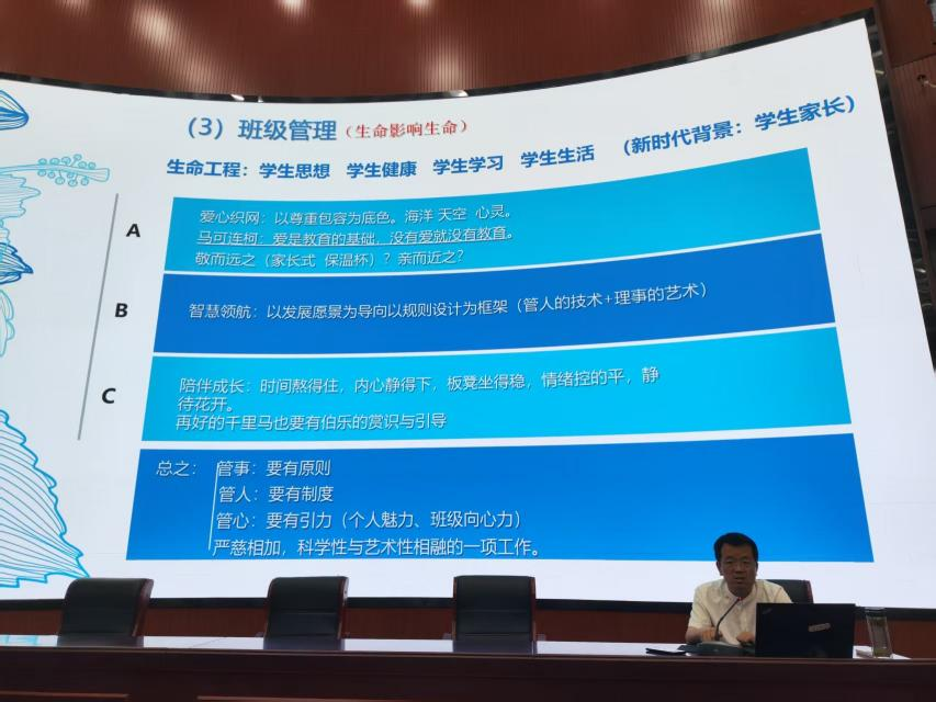 郝东蕴以“班主任:做育人教书的中国好老师”为题,与我院师生分享了自己的班主任经验。在报告中,郝东蕴主任首先分享了自己二十多年的班主任工作中的“苦”与“乐”,认为班主任是学校、科室、学生、家长的依靠。在班级管理方面,郝主任分享了“画方框”、“画圆饼”、“画叉号”、“画对号”的班级管理的技与艺,认为这是一项严慈相加,科学性与艺术性相融的一项工作,需做到管事要有原则、管人要有制度、管心要有引力。最后,提出了新时代下班主任专业成长的几点新需求:加强学习、不断突破、加强情趣、善于生活。