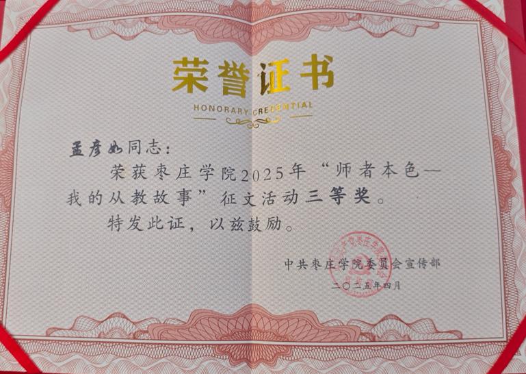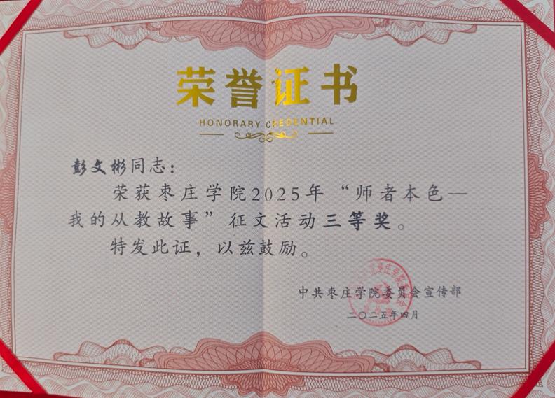 比赛期间,学院教职工积极报名,踊跃投稿,涌现出大量优秀作品,参赛教师们秉承教育初心,以笔为媒,深情书写从教路上的坚守与情怀。他们以丰富的教学实践为脉络,从坚定理想信念、秉持道德情操、展现育人智慧等多个维度,娓娓道来自己在教育教学过程中的深刻感悟,字里行间展现出教师们“为党育人、为国育才”的初心使命,生动诠释着“躬耕教坛”的不懈坚守。经过激烈的角逐,我院孟彦如、彭文彬老师脱颖而出,荣获三等奖。
