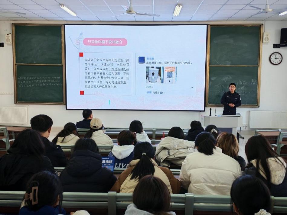 讲座伊始,刘浩元提出,当前校园诈骗案件呈高发态势,说明了电信网络诈骗对大学生财产安全、学习生活的潜在危害,并呼吁同学们以此次讲座为契机,主动学习了解反诈知识,将反诈知识学悟深透。随后,刘浩元指出,当前背景下新型诈骗手段层出不穷“刷单返现”“校园贷”等诈骗手段威势正盛,并结合一些大学生受骗的经典案例,帮助同学们掌握实用防诈技巧,提升主动规避诈骗陷阱的能力。最后,刘浩元强调,面对诈骗陷阱,同学们要不贪利、不轻信,理性科学看待,通过正规渠道辨别真伪,筑牢自身反诈“防火线”。