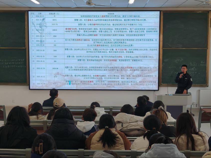 为深入推进党建引领校园安全工作走深走实,提高风险防范处置能力,11月19日,旅游与资源学院在崇德楼4208教室开展防诈骗主题讲座。本次活动特邀薛城公安分局沙沟派出所民警刘浩元主讲,部分2025级学生和师生参加。