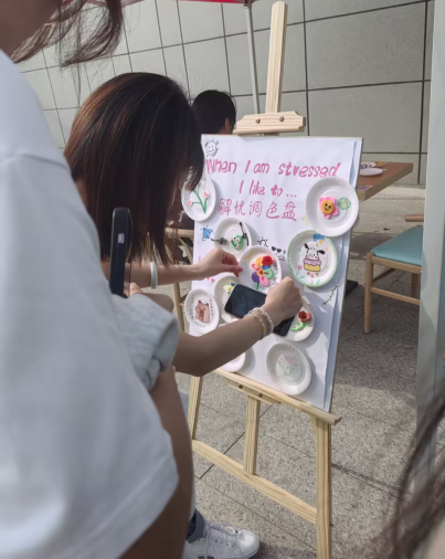 学院心理志愿者提前在莲花餐厅门口备妥丰富物料,包括画笔、马克笔、画纸、调色盘、彩泥、不同颜色的颜料等绘画工具,还准备了便签纸,供同学们写下自己的情绪或绘制图案。志愿者向参与同学讲解活动规则:同学们可根据自身当下的情绪状态,选取对应色彩的工具,通过线条、图案、色块等形式自由创作,将无形的情绪转化为有形的艺术作品。创作过程中,同学们沉浸其中,或用明亮的暖色调勾勒愉悦心境,或用柔和的冷色调抒发细腻思绪,或通过丰富的色彩碰撞释放内心压力。志愿者们在现场全程陪伴,主动与有需要的同学交流创作思路,倾听其情绪表达,给予积极的心理引导。
