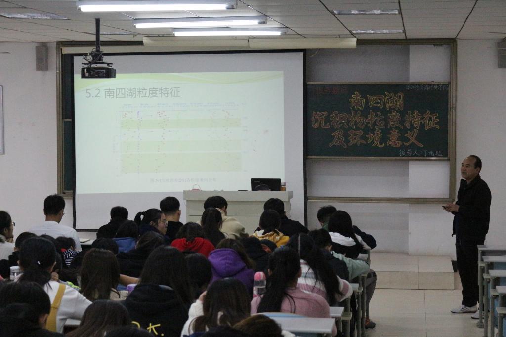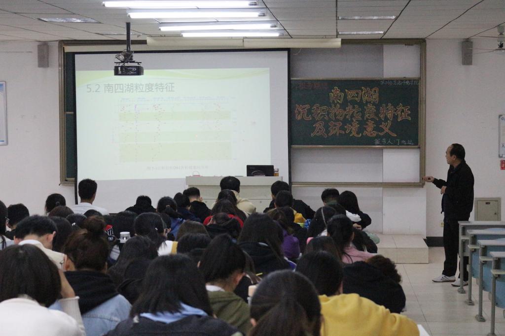 会议伊始,丁老师说明了整个会议的流程,主要分为研究的背景与意义、国内外研究进展、研究区域概括、研究方法和主要研究结论这五个方面。首先,丁老师介绍了全球环境变化的背景,讲解了湖泊沉积的特点,以及湖泊流域的人类活动加剧的现象。其次,在研究区域方面,介绍了南四湖的地理位置、水利工程和基本情况等内容。然后,研究方法包括采样方法、放射性同位素比活度测定与粒度测定等。丁老师还总结了有关粒度的基本原理,以及粒度分级和粒度特征的相关内容,通过丰富的PPT演示,提高同学们对科研的兴趣。会议最后,同学们也以热烈的掌声感谢丁老师精彩的报告。