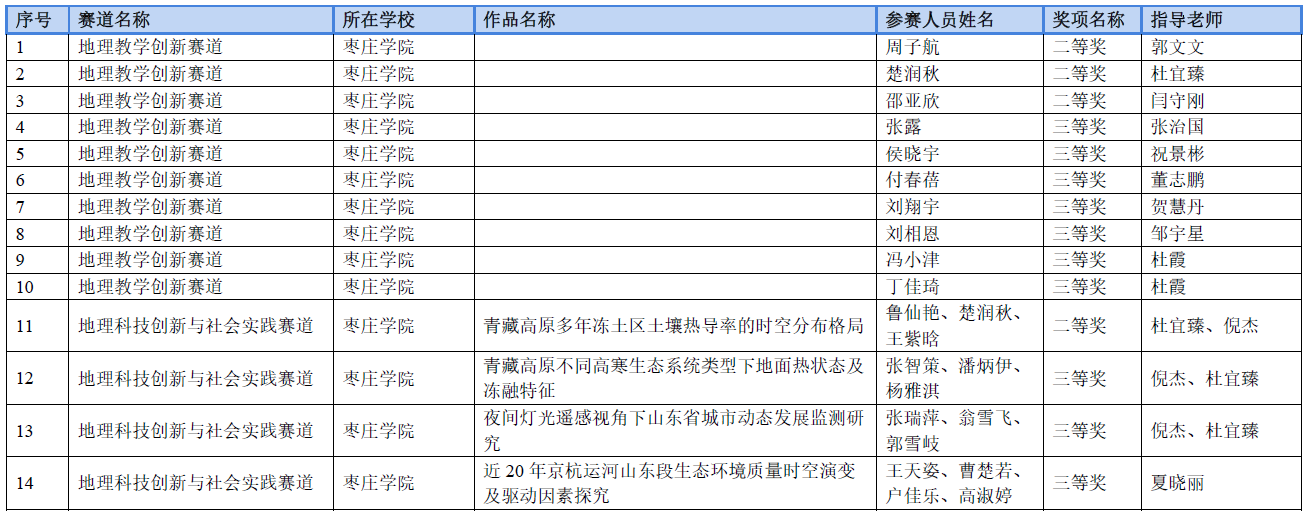 近日,第十七届山东省大学生科技节——山东省大学生地理创新大赛决赛成绩公布。我院地理科学专业学子取得了地理教学创新赛道二等奖3项,三等奖7项,地理科技创新与社会实践赛道二等奖1项,三等奖3项的优异成绩,充分彰显地理师范专业学生的职业素养与昂扬风采。