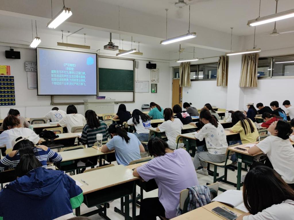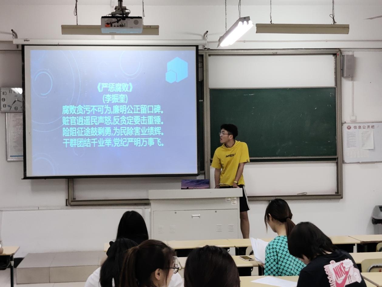 前,纪检部副部长付傲伟宣读比赛规则,根据幻灯片所投廉政诗词进行书写,要求书写工整,字迹清晰。比赛开始,同学们个个坐姿端正,纷纷提笔在纸上用心的书写一个个汉字,一笔一画书写工整行楷,一撇一捺彰显自我风采,力求向大家展示出自己最好的书写水平。
