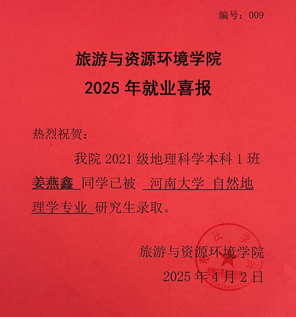 喜报!21地理科学本科1班姜燕鑫被河南大学录取!
