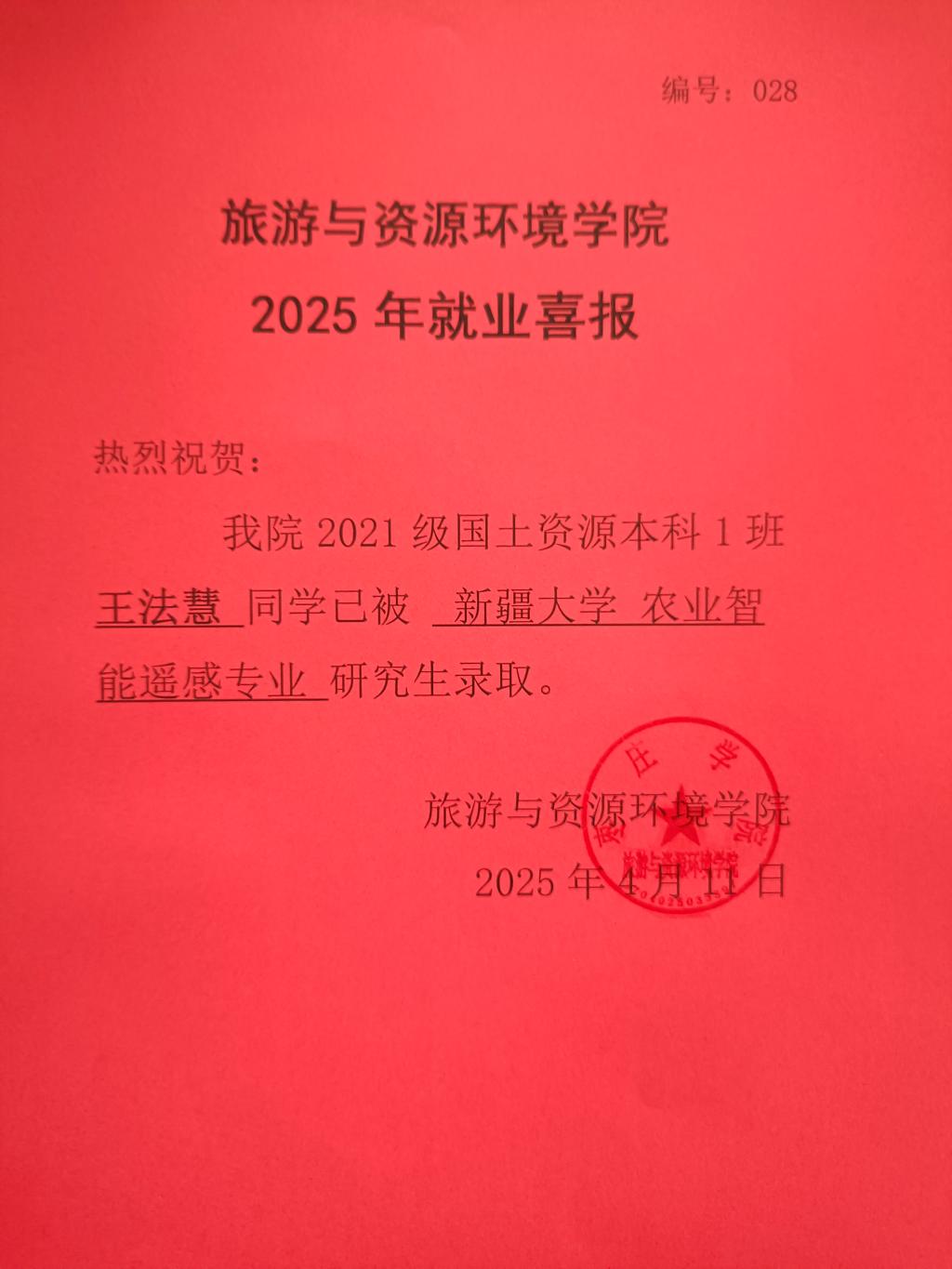 喜报!21国土资源本科1班王法慧被新疆大学录取!