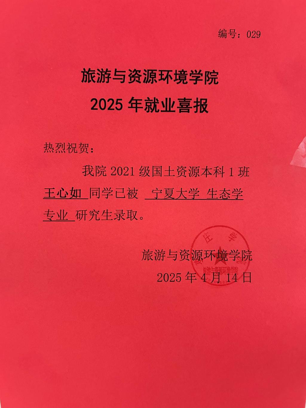 喜报!21国土资源本科1班王心如被宁夏大学录取!