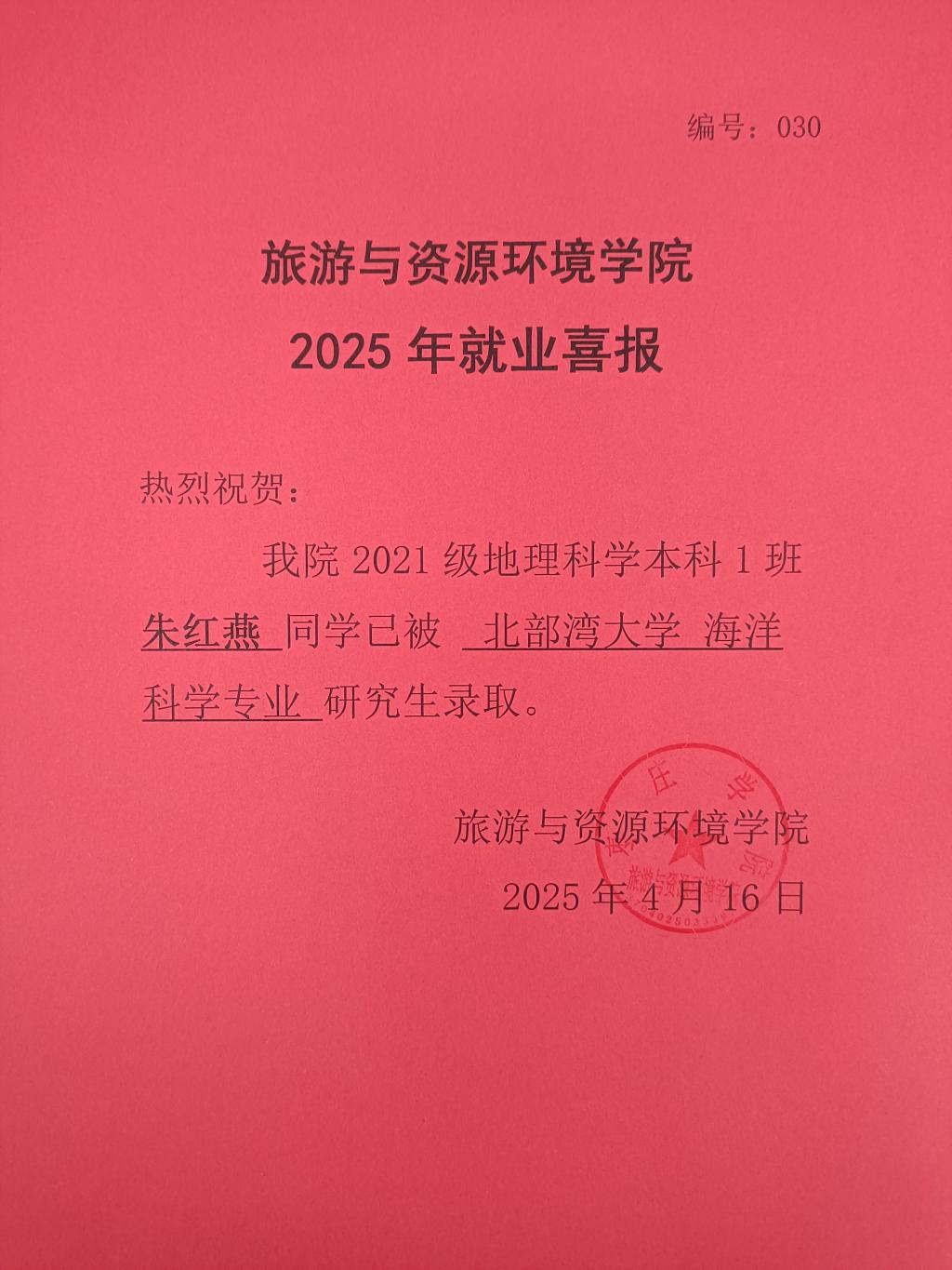 喜报!21地理科学本科1班朱红燕被北部湾大学录取!