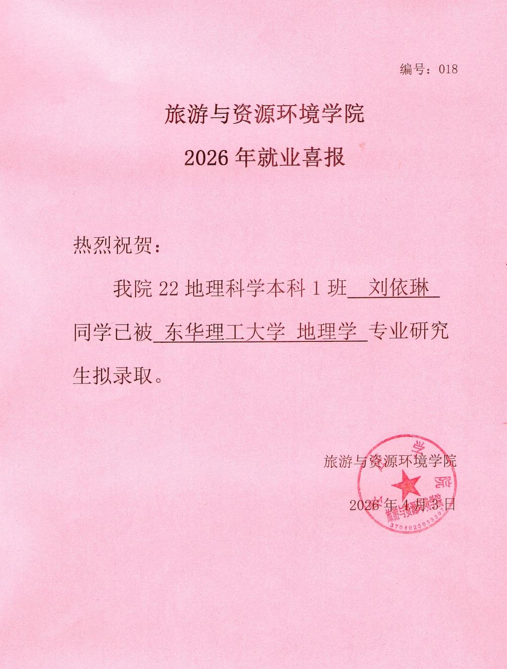喜报!22地理科学本科1班刘依琳被东华理工大学录取!